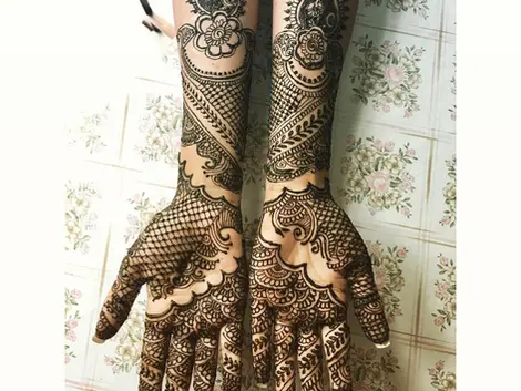 Intricate henna designs applied to the entire arm, from wrist to shoulder.